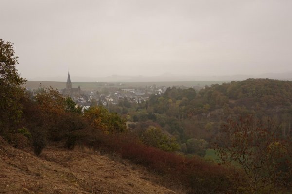 pyrmonter felsensteig – mit gefühlt 350 mitwanderern. am reizvollsten ist der teil im elzbachtal; der anstieg von der pyrmonter mühle zum sammetzkopf durch die maifelder agrarwüste bringts nicht so richtig. man sollte vielleicht hin und zurück durchs elzbachtal laufen. aber die aussicht von da oben ist gut. wenn es nur klarer gewesen wäre.