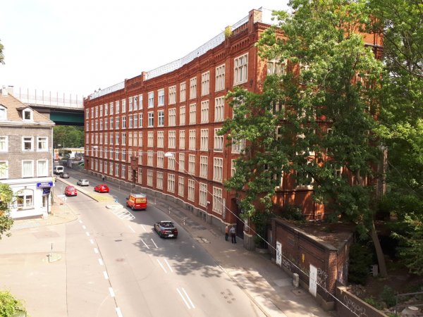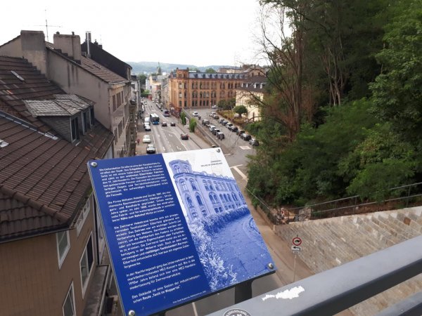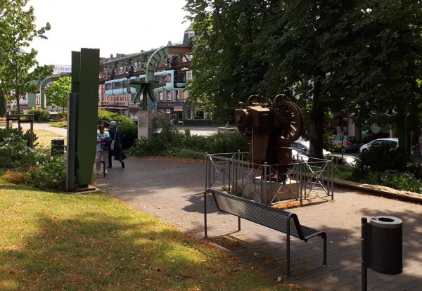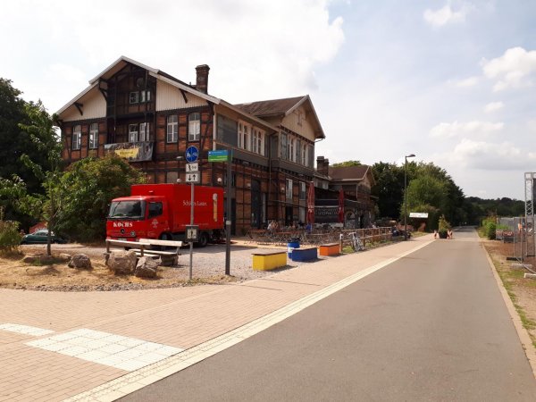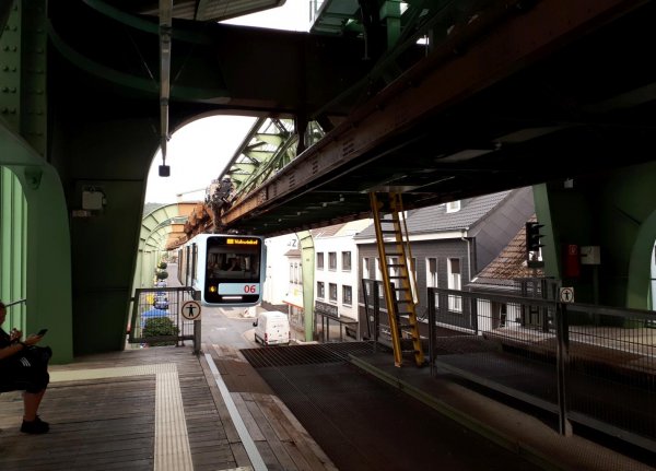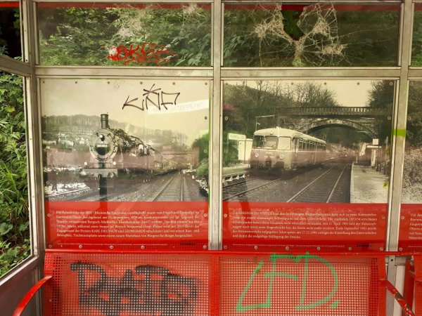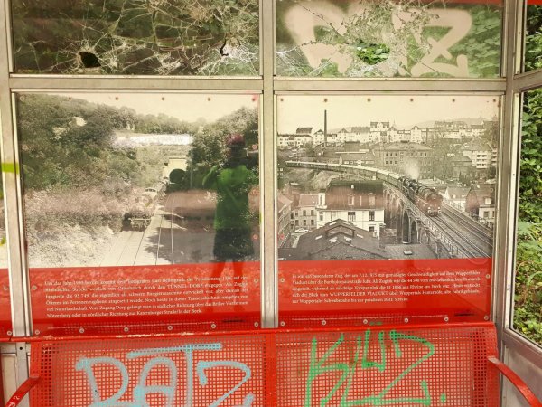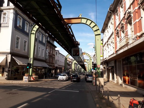 wuppertal-vohwinkel, naja, hat schonmal bessere zeiten gesehen, kein restaurant gefunden, nur imbissbuden. selbst die pizzeria, die in osm noch eingezeichnet ist, gibts nicht mehr (osm: Unresolved note #1879307). in einer kleinen kneipe gabs dann immerhin eine portion knoblauchspaghetti und einen rotwein am tisch draußen unter der schwebebahn.