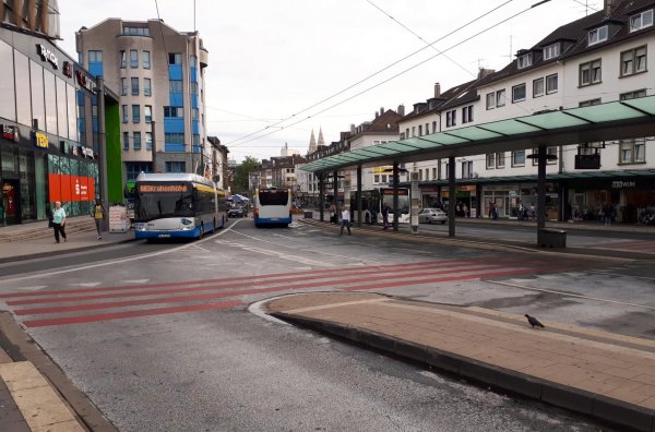 auf der korkenziehertrasse gibts immerhin schon etwas mehr ausblicke, aber richtig lohnen tuts auch nicht. das stadtzentrum von solingen liegt bei 230 m, also auch wieder 100 höhenmeter von vohwinkel. solingen hat immerhin noch ein obusnetz und zumindest am zob zebrastreifen in rot und in der richtigen richtung. nix vernünftiges gefunden für zweites frühstück. wie überall, außer am neckar oder so, cafe-konditoreien gibts nicht mehr, nur noch fabrikbäckereien. deshalb ohne einkehr wieder zurück. müngstener brücke hab ich sein gelassen, zuviel aufwand und höhenmeter; mal genug bergisches land.