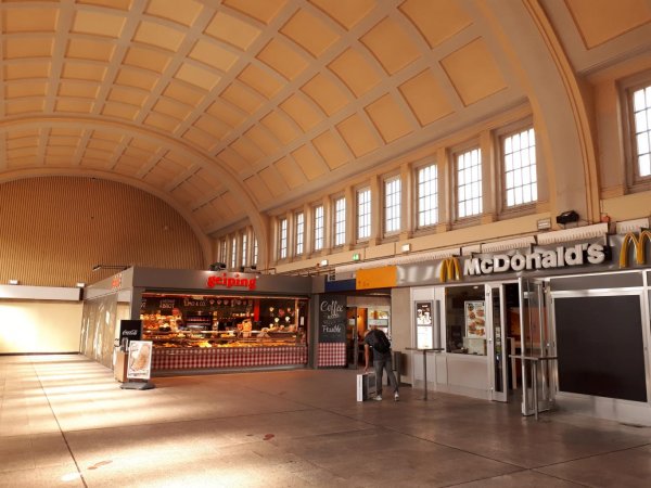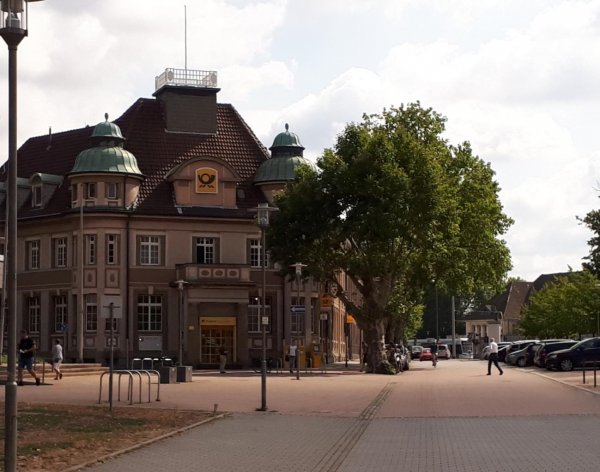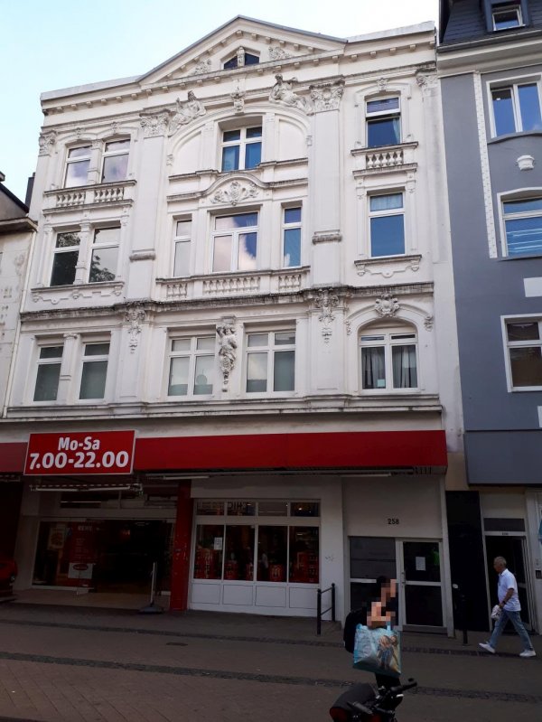 wetter wie gestern, sonnig, relativ frischer wind. kurz nach neun los zur erzbahntrasse und zum hbf wanne-eickel. naja, eigentlich schöne nachkriegsarchitektur, aber etwas heruntergekommen, innen die fenster zu, eine fabrikbäckereikette hat ihren verkaufsstand in der halle. und die mainstreet von wanne! uuuh!