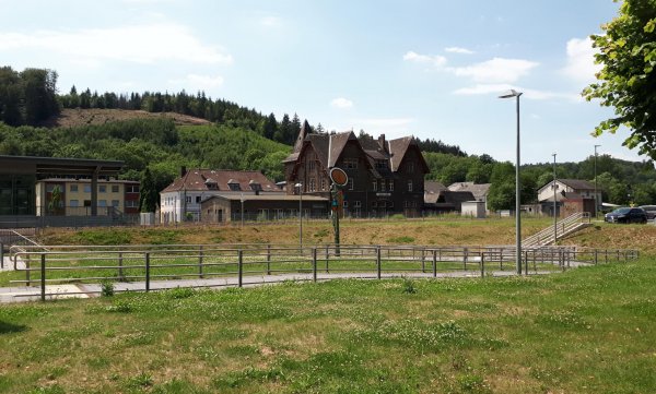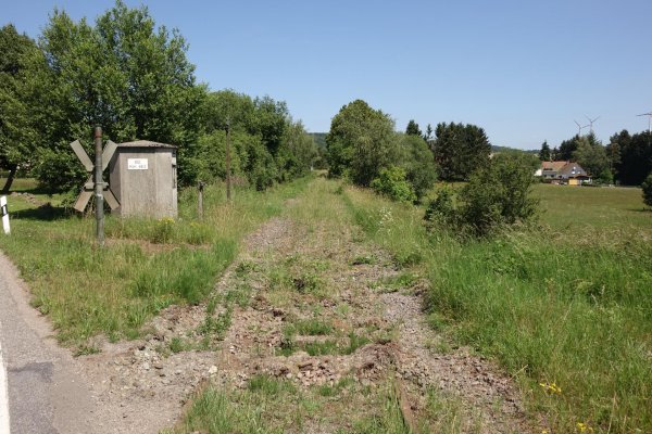 die letzten 20 m vor dem südportal des neuerburger tunnels sind freigehalten und es ist so einiges bahnzeugs aufgestellt, das wenigste original (betonschwellen und reflektierende baken!) und infotafeln über die enztalbahn. die strecke steigt bis zum hochpunkt um fast 200 m an, ist schön zu fahren, wenn auch wie bei all diesen bahntrassen im mittelgebirge seitlich mit bäumen zugewachsen, aber je höher man kommt umso mehr schöne ausblicke gibt es. auch nicht so viele pedelecs unterwegs wie sonstwo. die gegend ist dünn besiedelt und mit einkehren ist da nix. der einzige etwas größere ort ist arzfeld auf 500 m, bin aber nicht rein gefahren. am alten bahnhofsgebäude hat der besitzer ein paar umbauwagen auf einem gleis stehen und sehr viel gerümpel gesammelt. der mieter des gebäudes sagte, dass der besitzer pleite sei, die gemeinde das gelände kaufen und plattmachen wolle für wohnbebauung. die luxemburger (zur grenze luftlinie 10 km) kaufen alles, nur wohl kein altes bahnhofsgebäude.