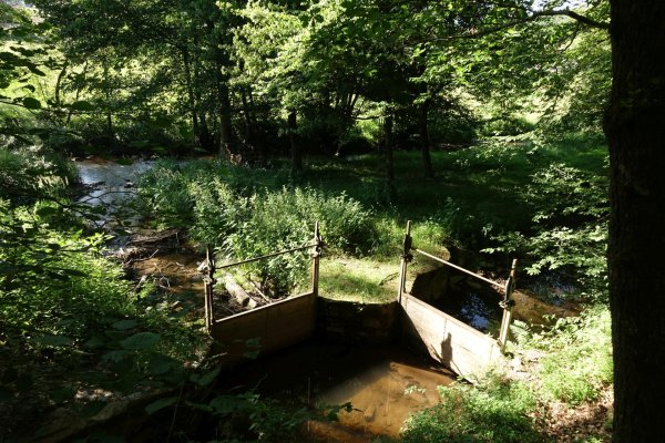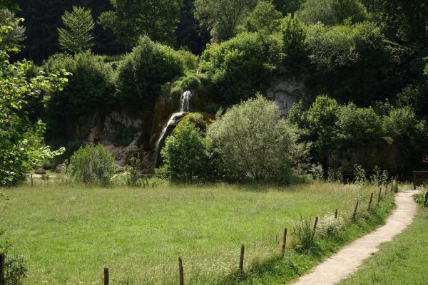 in kerpen, hübsch hergerichtetes dorf, einen ebenso hübschen brunnen mit kühlem frischem wasser gefunden, gerade zur rechten zeit. beim weiterfahren fiel mir die wegführung mit kleinen einschnitten sofort als ehemalige bahntrasse auf, die der mittleren ahrtalbahn. hinter kerpen der straße nach hoch und wieder runter zum parkplatz des dreimühlen-wasserfalles. den abstecher von 2 km auf waldweg hab ich mir gegönnt, bin aber nicht bis unter den wasserfall.