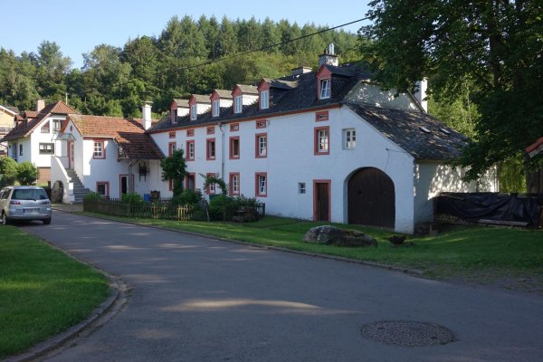 reichhaltiges frühstück in standardqualität auf dem zimmer, halbneun gestartet. die vennbahn lohnt schon, viele rennradler unterwegs, auch e-mopeds (klar, die dürfen da mit dem selben recht fahren wie ich), von den ausblicken immer wieder schön, wenn auch nicht spektakulär. ab weywertz wurde es neu (das stück von st. vith bis weywertz kannte ich ja schon von der tour): die vennquerbahn wurde aus militärischen gründen gebaut und war zweigleisig, entsprechend breite trasse. der bütgenbacher stausee zieht sich recht lang dahin, im zulaufbereich auch wieder hochmoorartiger bewuchs. am hochpunkt auf 645 m, kurz vor der grenze, waren zwei männer dabei, eine wasserpumpe für die dampfloks mit viel schwarzer farbe anzustreichen; wird wohl auch noch eine infotafel bekommen. eines der ganz wenigen relikte aus der eisenbahnzeit, auf dem weywertzer gleisfeld stehen noch einige lichtmasten. im weiteren verlauf abwärts nach stadtkyll noch viele bahnfernsprechermasten. schön mäandernde strecke nach stadtkyll runter, am kronenburger see mit strandbad vorbei.