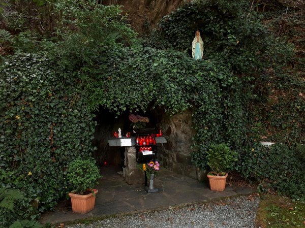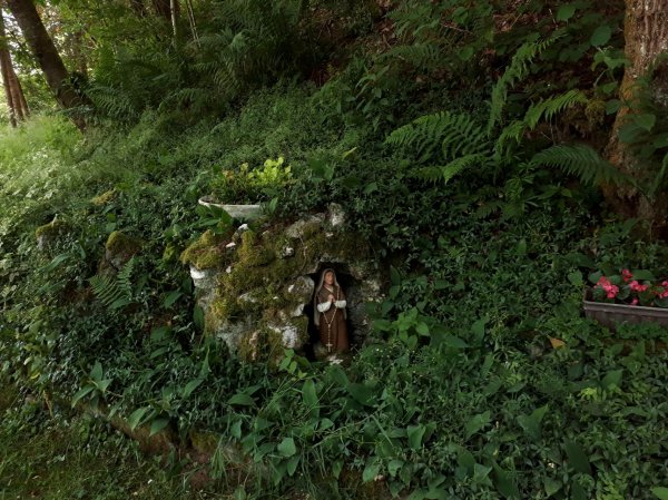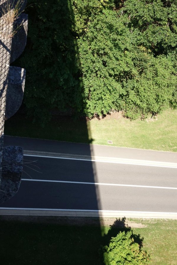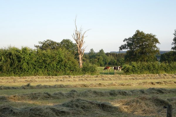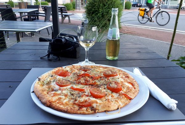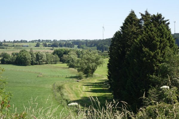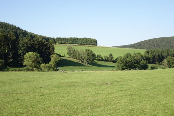 kurz vor sechs bei der unterkunft, ein neues gebäude, etwas außerhalb mit blick über die weiden und eifel und ardennen, auch von meinem schmalen souterrainzimmer aus. die gegend heißt offiziell deutsche gemeinschaft, neuerdings markenname ostbelgien; standardsprache ist deutsch. kurzer fußweg in die stadt, die recht ansprechend nach der fast-totalzerstörung während der sog. ardennenoffensive an weihnachten 1944 wieder aufgebaut wurde. st. vith ist eine richtige kleinstadt mit infrastruktur, hätte ich von vornherein als etappenort planen sollen. sehr viel auto- und motorradfahrer, die mit bekloppter geschwindigkeit die schmale hauptstraße entlang brettern. aber an den fußgängerüberwegen halten alle brav an, auch wo ich etwas unschlüssig da rum stand, zur not auch mal mit schärferem bremsen. im restaurant an den linden am ende der hauptstraße draußen eine vegetarische ungarische pizza mit ziegenkäse, paprika, tomaten und knoblauch gegessen und eine (gerolsteiner) apfelschorle dazu. zur begrüßung gabs eine leckere kleine pikante reisvorspeise mit einem gläschen zitronen-gurken-limonade, letzteres scheint en vogue zu sein.