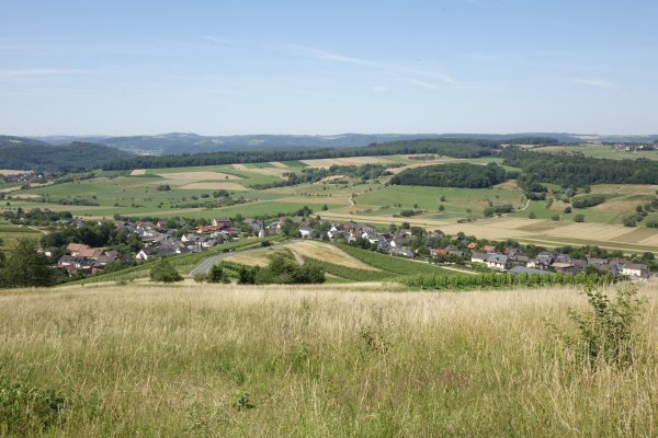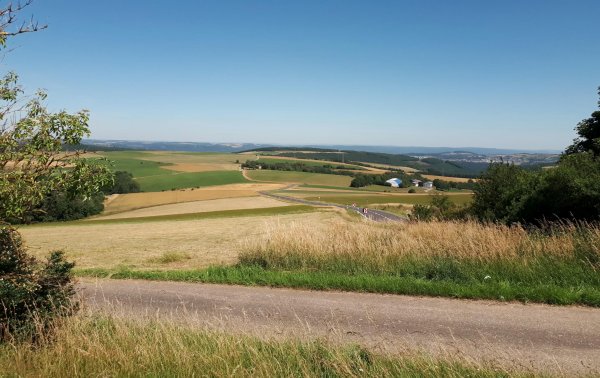 in pluwigerhammer auf der straße aus dem ruwertal nach pluwig hoch, nach franzenheim runter und ab der pellinger mühle das erste stück auf einem nur schiebbaren, sehr steilen holprigen, historischen ortsverbindungsweg richtung pellingen; nach diesem stück gehts auf einem bergrücken asfaltiert und gemächlicher bis pellingen auf 450 m höhe. oberhalb von krettnach kurze pause, schon 2 liter wasser getrunken. in niedermennig mal wieder blödsinnige wegführung durchs neubaugebiet statt weiter abwärts an der straße, auf die man em ortsende sowieso wieder trifft.