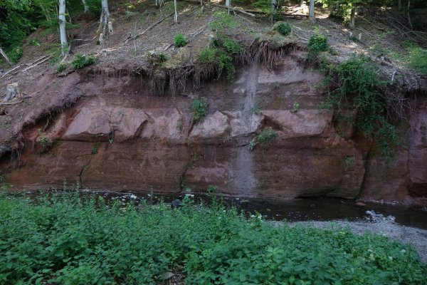 in holsthum bei einer historischen ruine und dem „schloss“ mündet die enz in die prüm, hab ich erst später gesehen, dort gibt es einen kleinen und einen großen gasthof die auch zimmer haben. sieht man nur, wenn man der ausgeschilderten route (etwas weiter und mehr höhenmeter) folgt und nicht der straße nach peffingen. von peffingen gehts über die straße und übern berg nach enzen. auch dort wieder umständliche routenführung zwanghaft von der straße weg und nach 1,5 km doch wieder auf die straße nach mettendorf. dort bin ich nicht der ausschilderung gefolgt, sondern auf straße durch den ort, dahinter aber wieder der route am bach entlang, wo man an einem imposanten buntsandsteinabbruch (Roter Puhl) vorbei kommt. 5 km vor neuerburg wird das tal so felsig schluchtig eng, dass die radroute auf der straße geführt wird.