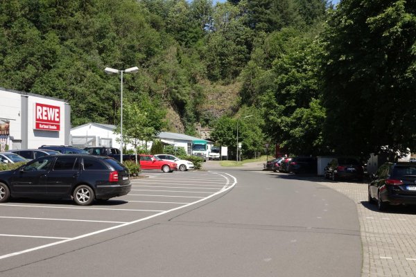 ich dachte in neuerburg müsste es doch ein cafe geben, wo ich ausgiebig frühstücken könnte, es war mittlerweile 11 uhr. das cafe-restaurant am platz machte gerade auf, das einzige was es gab war eine halbe käsetorte und eine halbe nusstorte, speicher vor 10 jahren reloaded. hab dann ein stück nusstorte und einen cappu genommen. klar, beim rewe draußen vor dem tunnel gibts das übliche fabrikbackzeugs. dort hab ich mir einen liter orangenmangosaft mit ascorbinsäure gekauft. dieses gewerbe- und einkaufsgelände mit den üblichen geschäften ist das ehemalige bahnhofsgelände der enztalbahn, nix mehr zu sehen davon.