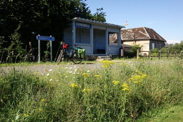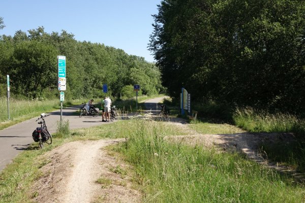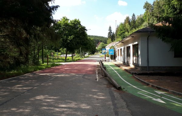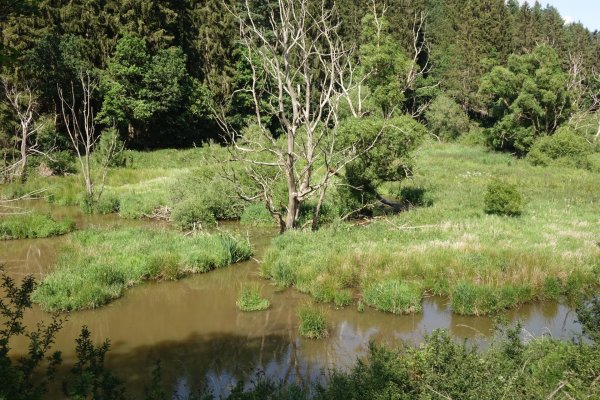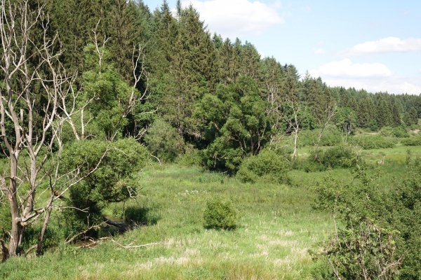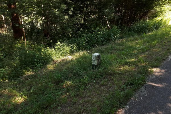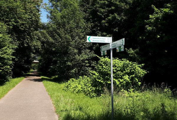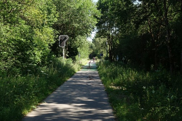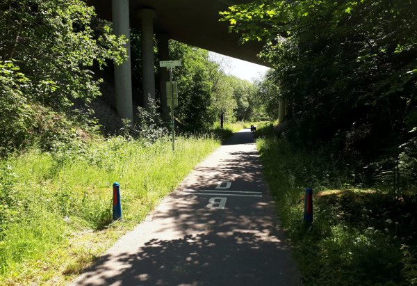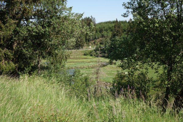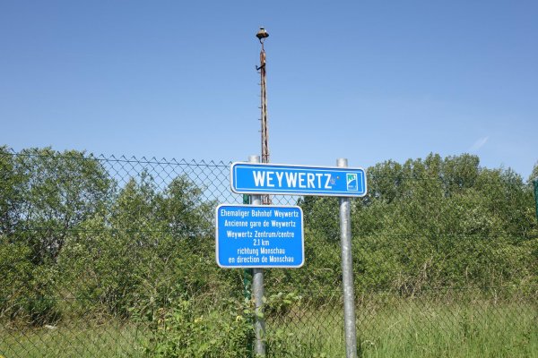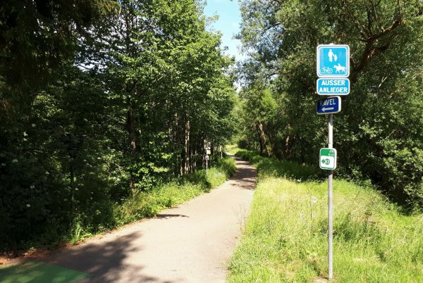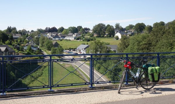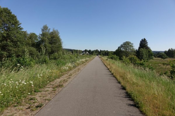 da pronsfeld außer ehemaligem westwall-eisenbahnknoten nix ist, bin ich direkt weiter auf der westeifelbahntrasse nach bleialf. die strecke ist schön, führt durch hochmoore, wenn auch mit riesenbärenklau durchsetzt. kaum noch e-mopeds, eher rennradfahrer und radreisende. bin nach bleialf rein und hab einen cappu und einen apfelkuchen verdrückt und dann ein zimmer in st. vith gebucht. zum hier übernachten wars mir noch zu früh, in dem ort gibts ja nix, womit man den rest des tages verbringen könnte. direkt unter dem cafe/bäckerei in der tiefgarage zwei flaschen wasser gekauft; öffentliche trinkwasserbrunnen gibts in der ganzen süd- und westeifel so gut wie keine. zurück zur bahntrasse und durch den bleialfer tunnel, dahinter durch ein ähnlich schönes tal, aber ohne riesenbärenklau bergab bis zur belgischen grenze an der our. nach ca. 2 km kommt der vennbahnradweg von burg reuland dazu und verläuft gemeinsam bis st. vith. an der stelle steht eine große infotafel mit unterkünften und restaurants in st. vith.