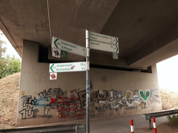 wieder sehr opulentes frühstück, wie vor 10 jahren. viertel vor neun bei etwas gedröbbel und kühlerem wetter los, regenjacke an und nach einem kilometer an der ersten steigung wieder ausgezogen. da die ortsdurchfahrt der B410 in hühnerbach wg. baustelle gesperrt war, hatte ich die straße bis zur nächsten einmündung für mich alleine, es war aber sowieso wenig samstagvormittagverkehr. vor boos kam ich wieder auf die geplante route, die bis münk auf asfaltierten wirtschaftswegen und dann auf einer kleinen landstraße auf einem bergrücken zwischen zwei bachtälern verläuft und am schluss steil ins elzbachtal führt und dort auf eine breitere landesstraße mit etwas mehr verkehr trifft. der ausgeschilderte bogen durch münk hätte nicht sein müssen, weiter geradeaus auf dem wirtschaftsweg wäre auch gegangen. im elzbachtal scheint an einem radweg nach monreal gebaut zu werden. kurz vor monreal wird die route mal wieder um viele ecken und über einen schmalen trampelpfad geführt, nur um nicht auf der straße zu fahren, auf die man nach weniger als 1 km wieder trifft. ok, man kommt unter einer schönen brücke der eifelquerbahn durch.