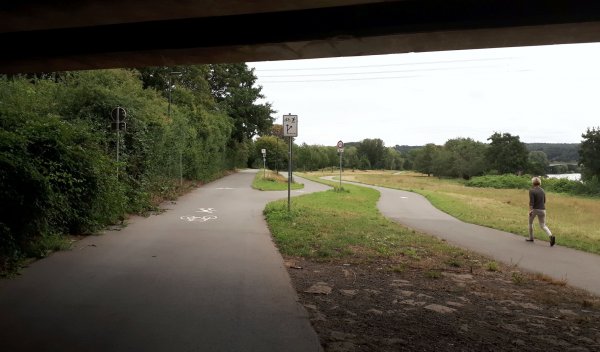 in kettwig, wie oft an der ruhr, verläuft die straßenbrücke auf dem stauwerk. am ufer dürfte bei wärmerem wetter viel los sein. nicht nach cafe geguckt, weil zu kühl, sondern weiter an der ruhr entlang. der leinpfad ist eigentlich ganz schön, abschnittsweise mit kopfweiden bestanden, aber auch etwas ungepflegt; wurzelaufbrüche, wasserseitig mit knöterich zugewachsen. und alle 50 m dreireihige pflasterquerstreifen, das scheint eine manie bei den essenern zu sein, um radfahren ungemütlich zu machen.