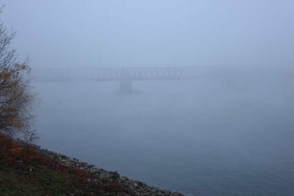 wieder eine wette gegen die wettervorhersage verloren, 50 km nebelfahrt in nasskaltem vordersüdrheinhessen. mainzer südbrücke.