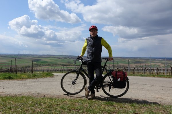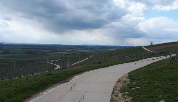 in groß-winternheim nach blick auf die landschaft und auf die karte zum westerberg abgebogen, am judenfriedhof vorbei, 150 höhenmeter extra und schöne aussicht. allerdings besteht auf dem steilen anstieg der belag aus rasenpflaster, weshalb ich schieben musste; sonst hätte ich die 18% steigung gerade so fahren können. schöner eichenwald da oben, die waldwege passabel zu fahren, aber nach gau-algesheim runter ausgewaschener, grob-schottrig-felsiger weg, nicht viel mehr als schritttempo drin.