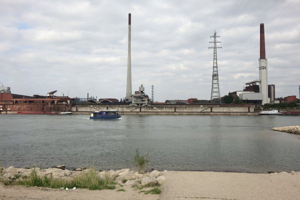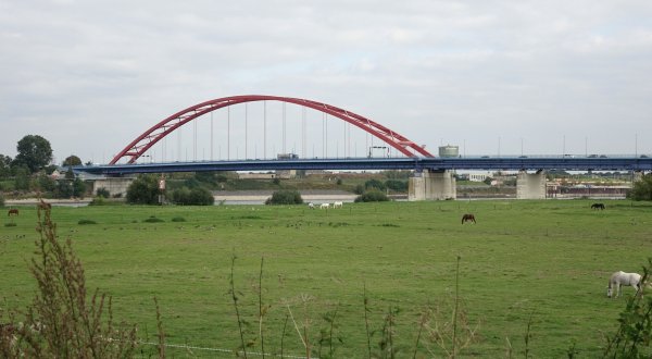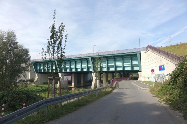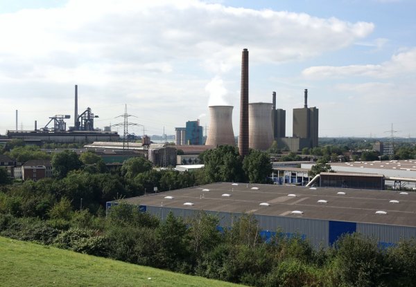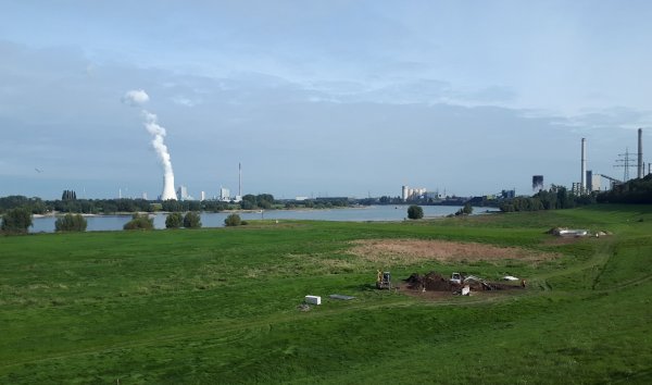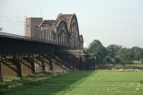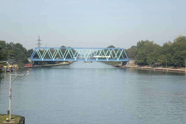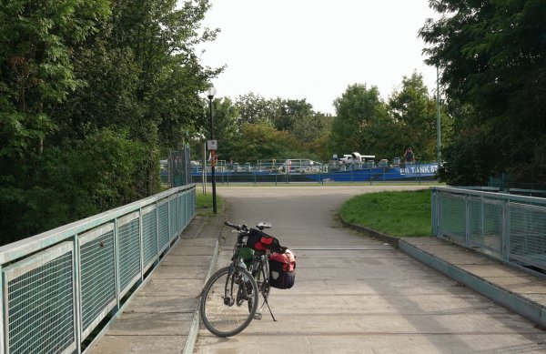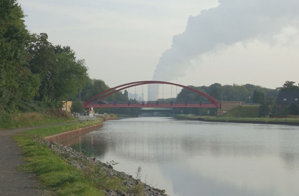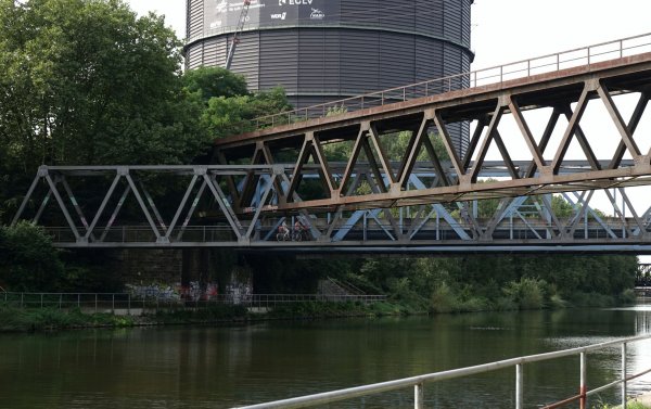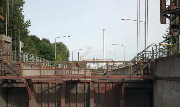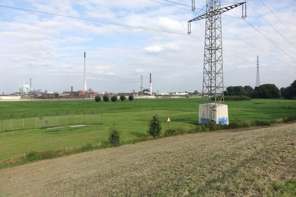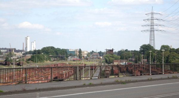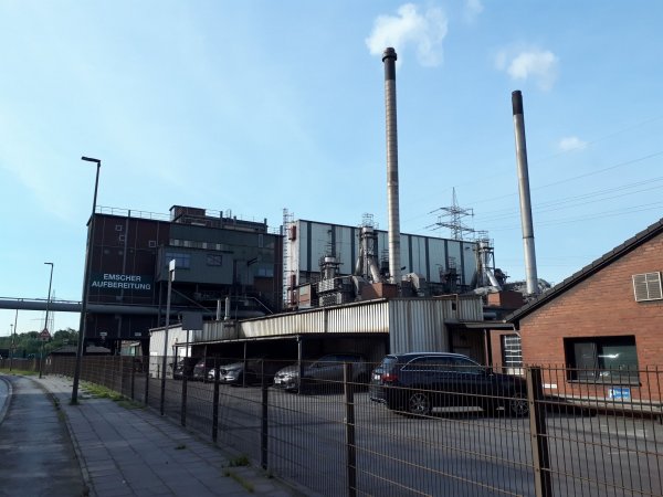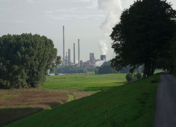 auf dem rheindeich den großen rheinbogen um das riesige werksgelände von thyssenkrupp steel europe in hamborn/bruckhausen. beeindruckend: die haus-knipp-eisenbahnbrücke. das klärwerk emscher-mündung ist auf diesem gelände, vom geschätzt 10 m hohen rheindeich aus sehr gut zu sehen. hab idiotischerweise kein bild gemacht, obwohl ich mir dachte, dass es diese kläranlage ist. beeindruckend die dicken heberleitungen über den rheindeich, womit die geklärte emscher in den rhein gemündet wird.