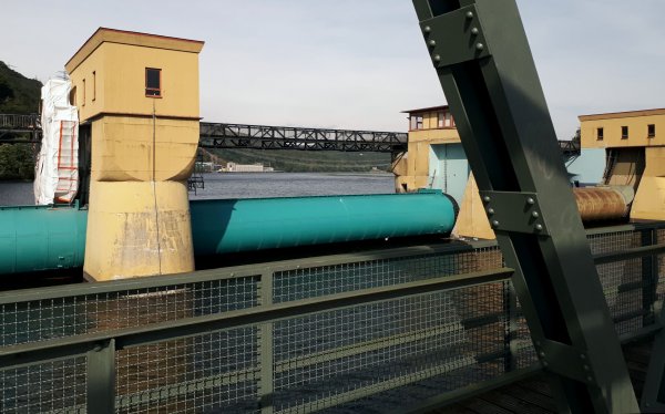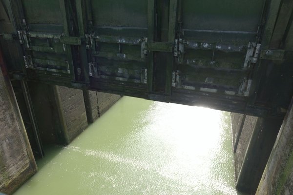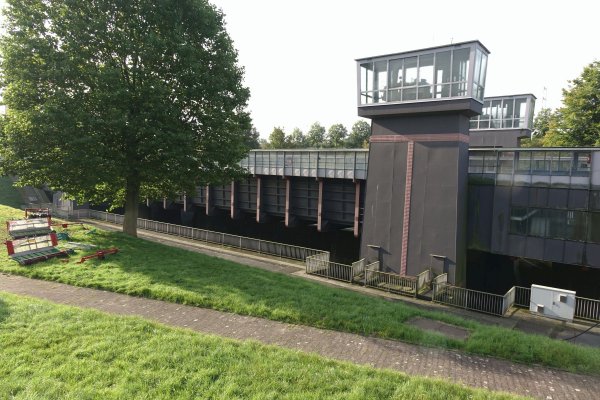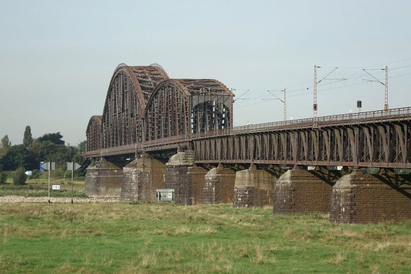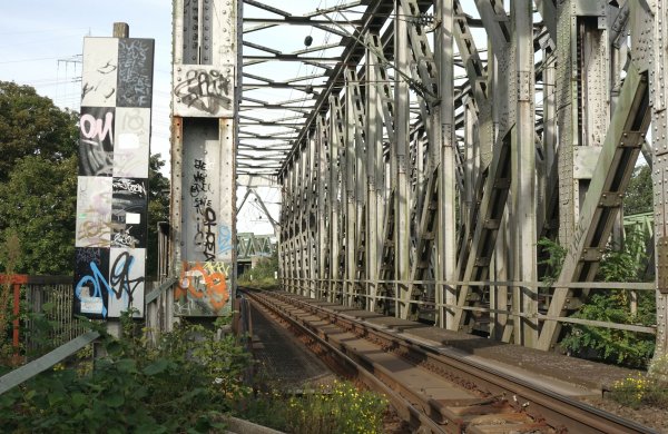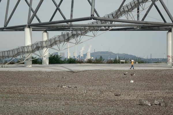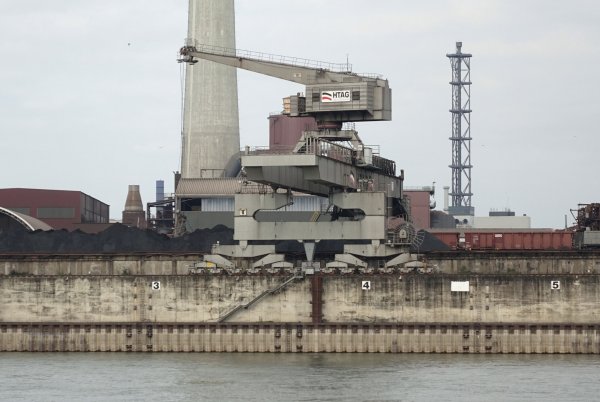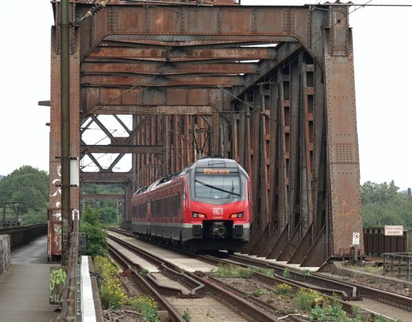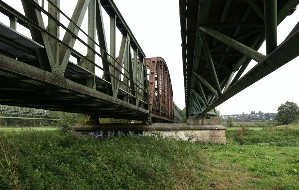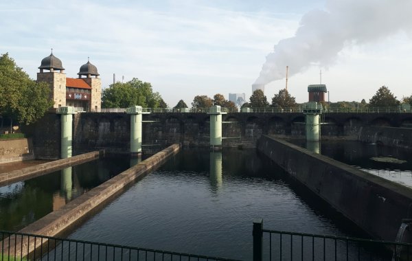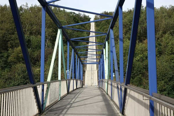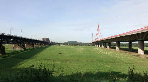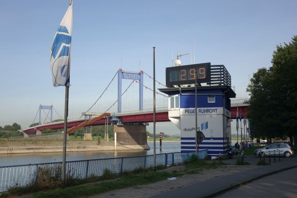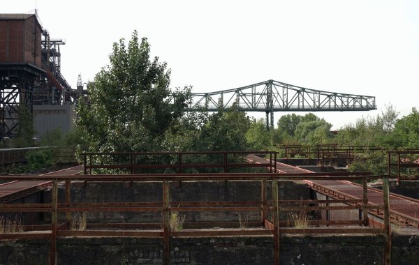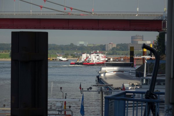 auf dem rheindeich den großen rheinbogen um das riesige werksgelände von thyssenkrupp steel europe in hamborn/bruckhausen. beeindruckend: die haus-knipp-eisenbahnbrücke. das klärwerk emscher-mündung ist auf diesem gelände, vom geschätzt 10 m hohen rheindeich aus sehr gut zu sehen. hab idiotischerweise kein bild gemacht, obwohl ich mir dachte, dass es diese kläranlage ist. beeindruckend die dicken heberleitungen über den rheindeich, womit die geklärte emscher in den rhein gemündet wird.