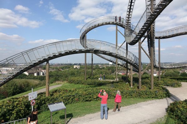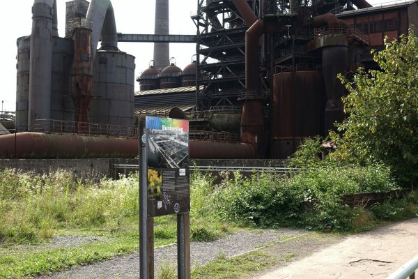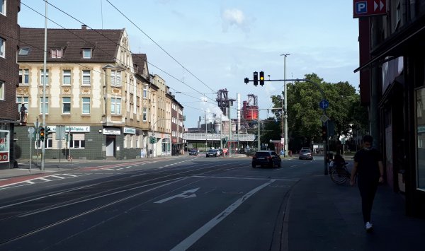 ab dem hüttenwerk krupp mannesmann HKM, die man von der halde tiger & turtle südwestlich sieht, der ortsteil heißt auch noch hüttenheim, radwegführung an der straße mit viel verkehr, meist schmale hochbordradwege in sauschlechtem zustand, holpriger asfalt, wurzeln. allerdings ist keiner dieser radfahrer-von-der-straße-räumen-radweg aus den 60ern als benutzungspflichtig ausgewiesen. das ist im ganzen ruhrgebiet meist so. aber viele straßen sind auch nicht besser, hundertmal huckelig ausgebessert. immerhin bin ich in den fünf tagen kein einziges mal angehupt worden, egal ob ich auf der straße statt radweg oder gegen die einbahnstraße oder durch einen für radfahrer verbotenen tunnel gefahren bin. insgesamt wird im ruhrgebiet (und im saarland) nach meinem eindruck weniger rad gefahren als anderswo; ist mir ja vor zwei jahren auch schon aufgefallen.