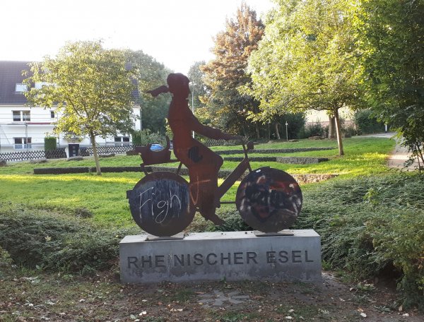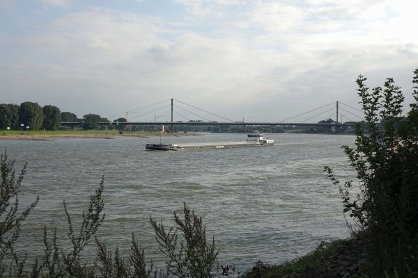 züge pünktlich, halbzwölf in düsseldorf bei sonnig bewölkt und frühherbstlich kühlem nordostwind gestartet. vom bahnhof direkt zum rhein und kurzer rundumblick. am rhein entlang und an der messe vorbei, z.t. schöne platanenalleen, stadtauswärts. wassergebundene radwege staubig trocken, was auch die nächsten drei tage so blieb.