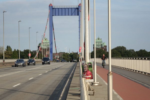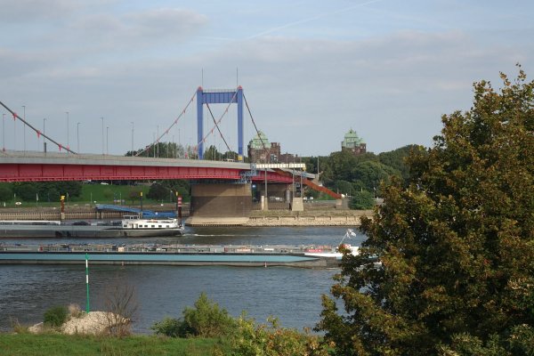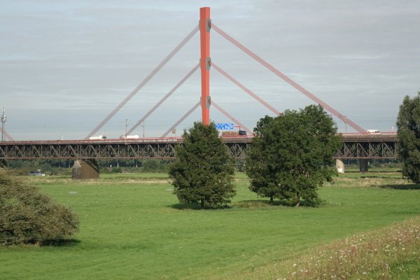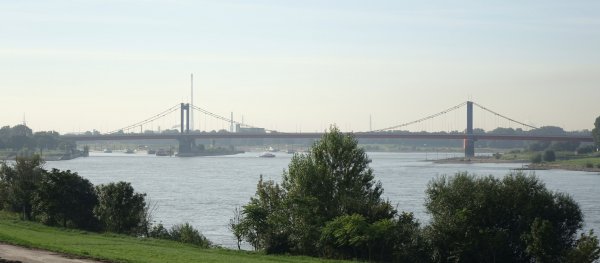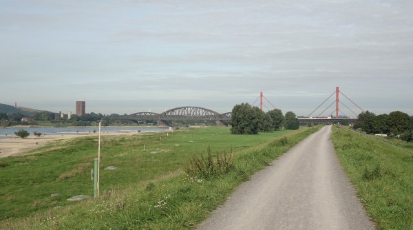 der radweg ab dem düsseldorfer wasserwerk ist doch schöner als erwartet, brauchbar asfaltiert, schöne hohe alte bäume, abschnittsweise auf dem winterdeich. kaiserswerth schnuckeliges städtchen, touristisch der marktplatz, ansonsten für die reichen düsseldorfer mit ihren villen am rhein. dahinter ein stück nagelneuer glatt asfaltierter radweg. wenig später schon die stadtgrenze von duisburg.