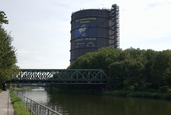 im landschaftspark nord im erzbunker mittags- und schminkpause und dann weiter zum emscherradweg. zuerst gehts 4 km auf dem grünen pfad, das ist die hoag-trasse, in buschhausen zum rhein-herne-kanal. ich hatte einen schlenker durch oberhausen-osterfeld geplant, weiß nicht mehr warum, vielleicht wegen der landesgartenschau 1999, der ältesten arbeitersiedlung oder des rangierbahnhofs; hab den abzweig verpasst und bin erst hinterm bahnhof nach bottrop zum tetraeder abgebogen.