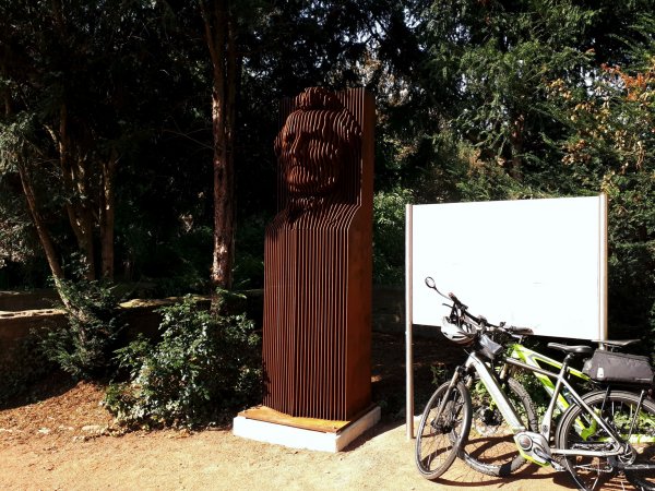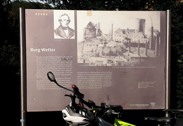 wieder den berg hoch nach volmarstein, die abfahrt ins ruhrtal auf der anderen seite sehr beschwerlich nur mit dauerbremsung in schrittgeschwindigkeit zu fahren wegen der durch das juli-unwetter heftigst ausgewaschenen wege, aber immerhin nicht gesperrt. ein stück ruhrabwärts nach wetter zum bahnhof, gedenktafel gefunden und wie vor zwei jahren zum eiscafe, der gleiche kellner; eisschokolade inhaliert. wie vor zwei jahren zur burgruine bei der kirche, wo mal die harkortsche fabrik stand, von der nix mehr zu sehen ist.