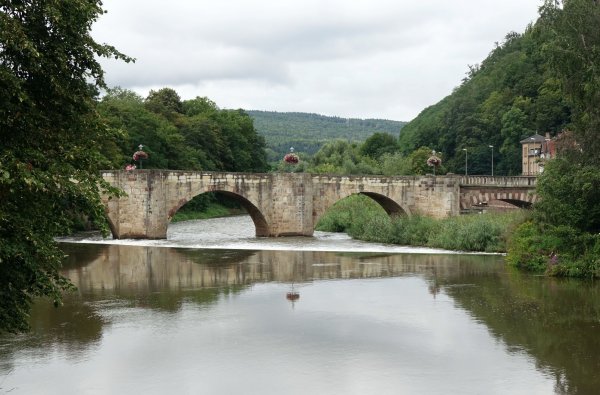 viertelvorzwölf auf der neuen weserbrücke von münden. erst mal werraaufwärts gefahren bis die ICE- und A7-brücken in den blick kamen; hab das tal ja schon so oft vom ICE aus gesehen. dann zurück und nach münden rein. am kirchplatz kuca-pause und geschminkt, da es mittlerweile sonnig war.